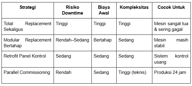 Mesin lama tidak selalu perlu diganti total. Dalam banyak kasus, yang perlu dimodernisasi adalah sistem kontrolnya. Dengan strategi replacement yang tepat seperti modular replacement dan parallel commissioning, perusahaan dapat menjaga kontinuitas produksi sekaligus meningkatkan stabilitas operasional dalam jangka panjang.